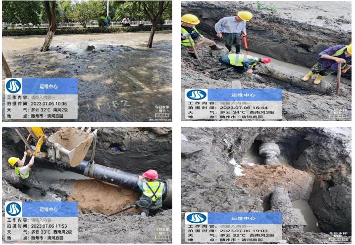 7月6日上午10點(diǎn)20分,客服人員接到群眾的熱線電話,告知清河路清河庭院附近路面大量跑水,運(yùn)維中心搶修人員接到消息迅速前往,十五分鐘到達(dá)現(xiàn)場,通過專業(yè)技能和判斷,確定為DN400主管道爆破,測漏人員立即協(xié)助精準(zhǔn)定位漏點(diǎn),盡量減少開挖面,為搶修爭取時(shí)間,該管道會(huì)直接影響周邊黃龍五隊(duì)、清河庭院、東方小區(qū)、楚苑小區(qū)、雙橋家具大市場等小區(qū)和企業(yè)大面積水小或停水??崾铍y耐,為盡快解決群眾用水問題,維修人員在35°高溫下連續(xù)奮戰(zhàn)8小時(shí),于當(dāng)晚7點(diǎn)30分恢復(fù)正常供水,及時(shí)避免了周邊居民下班后正常生活用水的問題。