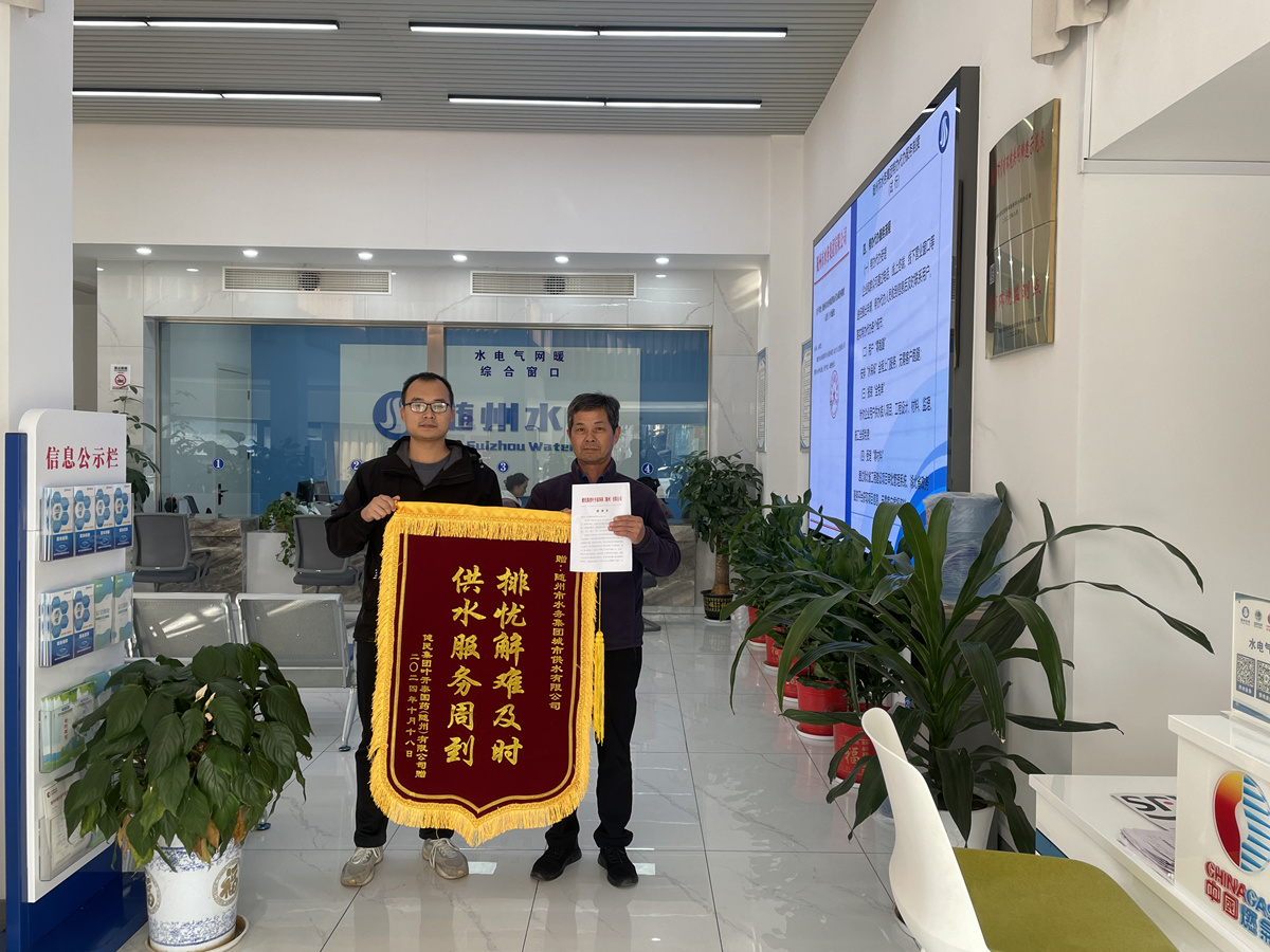 “排憂解難及時(shí) 供水服務(wù)周到”,近日,健民集團(tuán)葉開泰國(guó)藥(隨州)有限公司專程到隨州市水務(wù)集團(tuán)下屬子公司城市供水有限公司送上一面承載誠(chéng)摯謝意的錦旗和一封感謝信,他們用最質(zhì)樸、最真摯的方式,對(duì)公司運(yùn)維人員熱情、高效、便捷、暖心的服務(wù)表示誠(chéng)摯感謝。