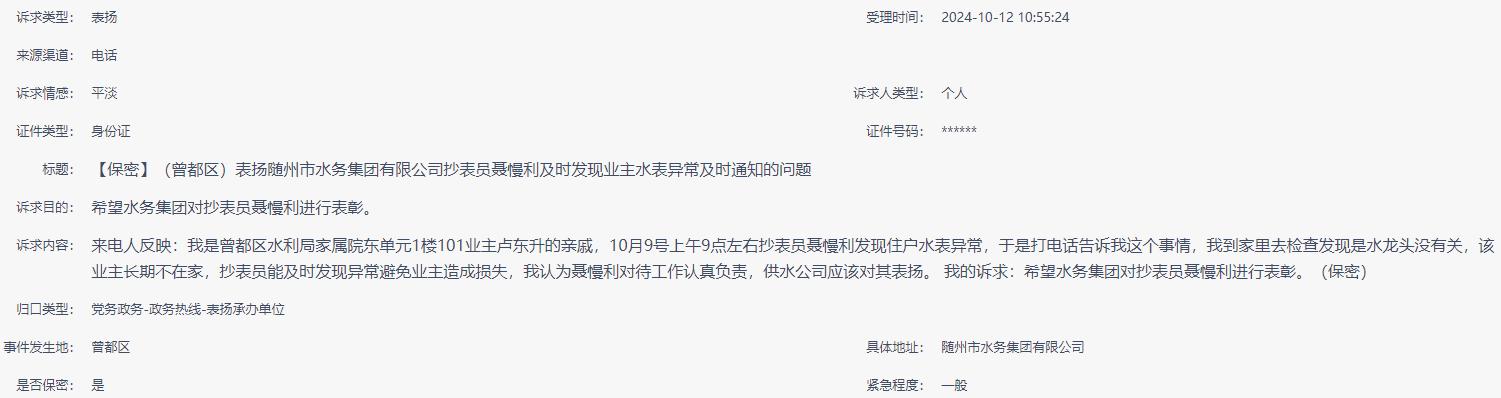 來電人反映:我是曾都區(qū)水利局家屬院東單元1樓101業(yè)主盧東升的親戚,10月9號(hào)上午9點(diǎn)左右抄表員聶慢利發(fā)現(xiàn)住戶水表異常,于是打電話告訴我這個(gè)事情,我到家里去檢查發(fā)現(xiàn)是水龍頭沒有關(guān),該業(yè)主長期不在家,抄表員能及時(shí)發(fā)現(xiàn)異常避免業(yè)主造成損失,我認(rèn)為聶慢利對待工作認(rèn)真負(fù)責(zé),供水公司應(yīng)該對其表揚(yáng)。 我的訴求:希望水務(wù)集團(tuán)對抄表員聶慢利進(jìn)行表彰。(保密) |