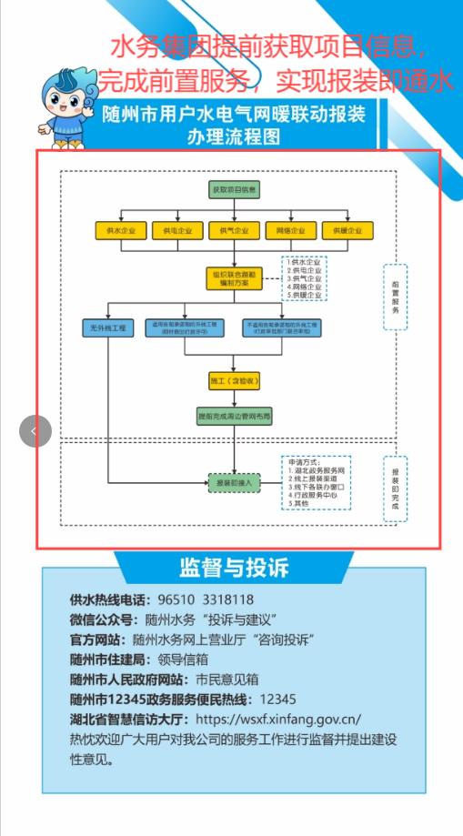 1.“零環(huán)節(jié)”:客戶需要用水時,即時通水; 2.“零跑腿”:安排“客服專員”全程上門服務(wù),無需客戶跑腿; 3.“零資料”:通過湖北省工程建設(shè)審批系統(tǒng)、湖北省政務(wù)服務(wù)平臺獲取項目信息,無需客戶提報資料; 4.“零費用”:針對企業(yè)用戶供水接入項目,工程設(shè)計、材料、監(jiān)理、施工全部免費。 |