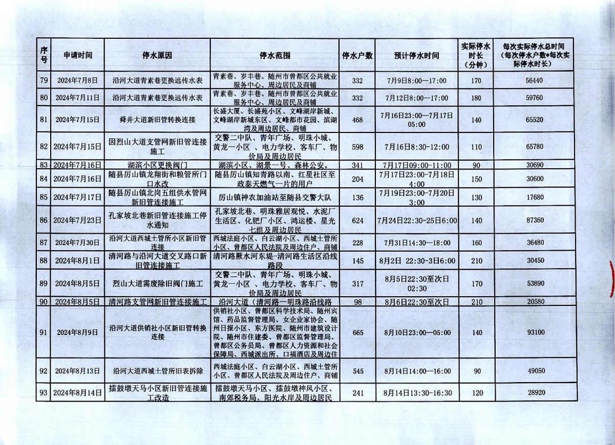 隨州市2023年9月至2024年8月計(jì)劃性停水資料