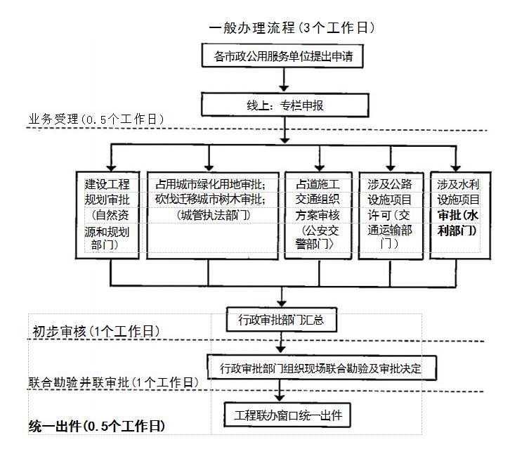 并聯(lián)審批辦理總時(shí)限:告知承諾制項(xiàng)目無(wú)需批前審批,由城 管、交通、公安審批部門(mén)加強(qiáng)現(xiàn)場(chǎng)實(shí)施監(jiān)管;一般審批項(xiàng)目3個(gè) 工作日(不含方案和評(píng)價(jià)報(bào)告編制時(shí)間、方案評(píng)審時(shí)間、申請(qǐng)人修改、審批前公示或公證時(shí)間)。